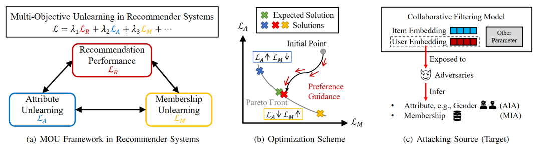 近日,通信工程学院智能信息计算团队的研究论文《Multi-Objective Unlearning in Recommender Systems via Preference Guided Pareto Exploration》被服务计算领域顶级国际期刊(CCF-A类)IEEE Transactions on Services Computing录用。论文第一作者为我院李宇渊特聘副教授,主要合作作者为浙江大学陈超超特聘研究员和我校颜成钢教授。 该研究聚焦推荐系统中的多目标遗忘问题。随着推荐系统对用户数据的持续收集与分析,用户隐私泄露风险日益凸显,特别是敏感信息可能通过用户画像特征发生泄露。为此,学术界已对推荐系统的“遗忘”问题展开广泛研究,其核心在于消除特定数据对推荐模型的影响。 该研究创新性地拓展了传统遗忘研究的范畴。现有研究多局限于单目标遗忘(如属性遗忘),而实际场景中用户往往需要实现多重遗忘目标。为填补这一研究空白,该研究提出训练后多目标遗忘框架,该框架不仅能同步实现多个遗忘目标,还能有效维持推荐系统的核心性能。需要特别指出的是,多目标间可能存在的冲突会导致总体目标优化过程中出现目标妥协现象。 针对该挑战,该研究创新性地引入帕累托探索方法:首先将推荐性能作为优化导向,进而在冲突目标间建立权衡机制以获得帕累托最优解。考虑到实际应用中训练后数据不可获取的特性,该研究采用无数据正则化方法来实现推荐性能引导。基于三个真实数据集的实验表明,所提方法在保持推荐性能的同时,能有效实现多遗忘目标的最优权衡。